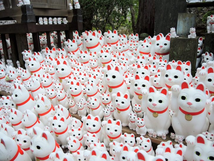 If you want to see hundreds of them, try visiting 豪徳寺(Gōtokuji) temple and 今戸神社(Imado jinja) shrine in Tokyo. You will be overwhelmed with the numerous Manekineko.